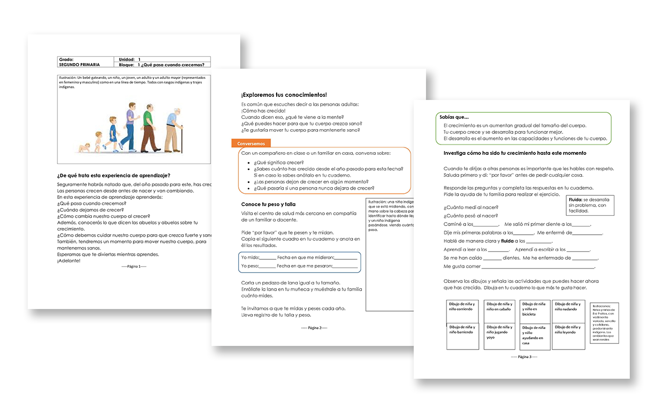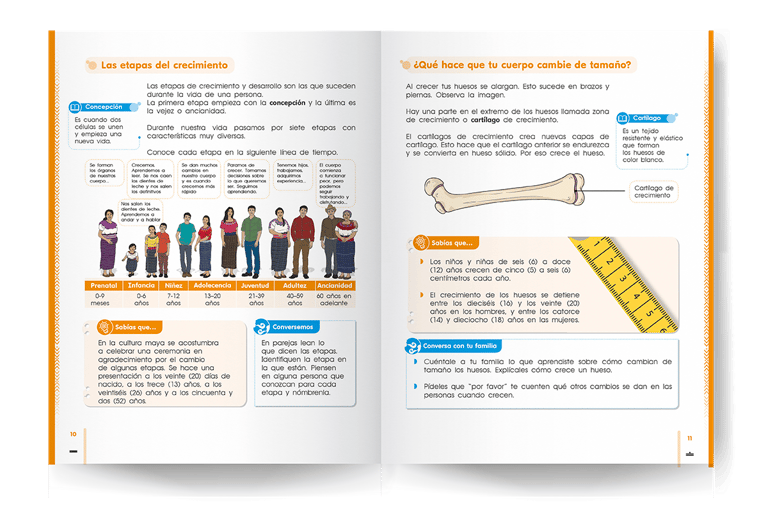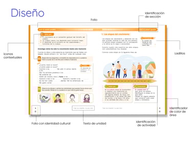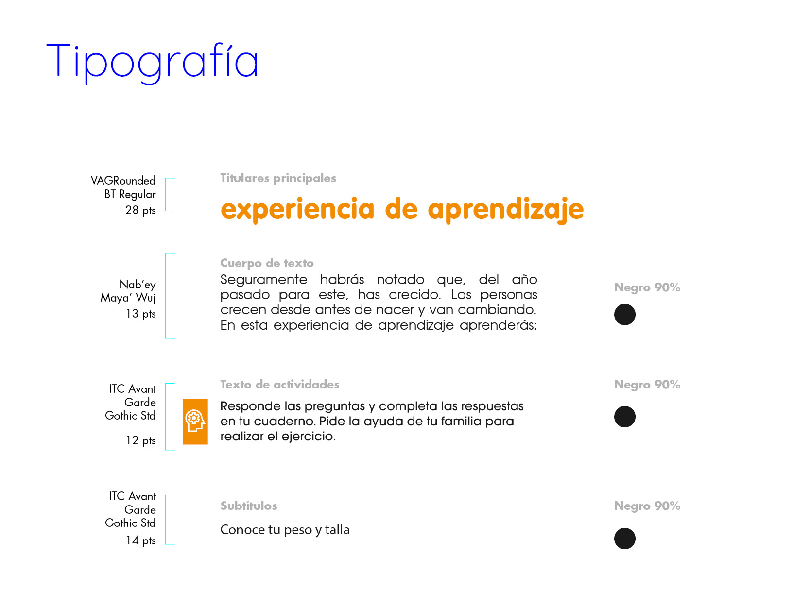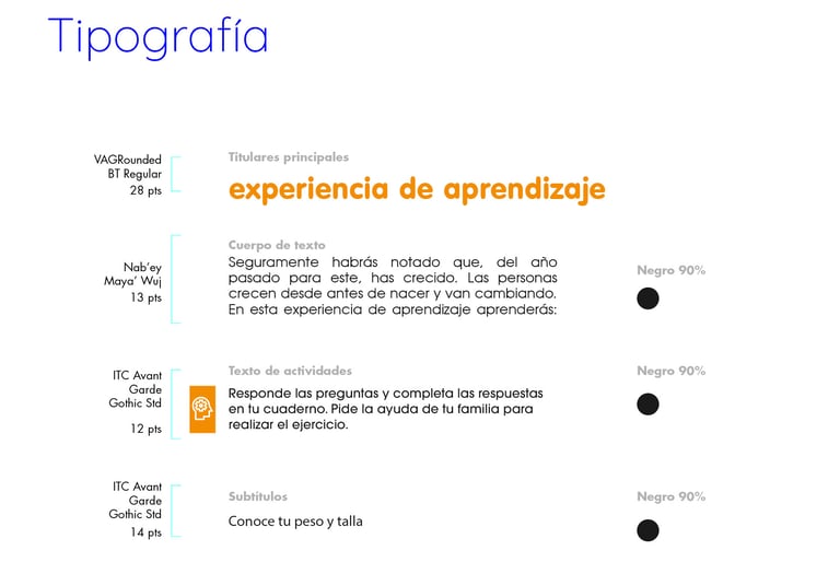 Durante la primera presentación, establecí las tipografías, colores, folios, identificación de secciones, ladillos y numerología maya para asegurar la pertinencia cultural. Además, integré iconos contextuales y ladillos que aportaban contexto a las lecciones del libro, así como términos que podrían presentar dificultades a los estudiantes. Trabajé en paletas de estilos para caracteres y párrafos, así como en el columnaje, longitud de palabras y caracteres por línea, márgenes y espacio negativo. Este primer acercamiento permitió al equipo de Digebi obtener una idea general sobre el diseño final y su integración con la cultura maya.